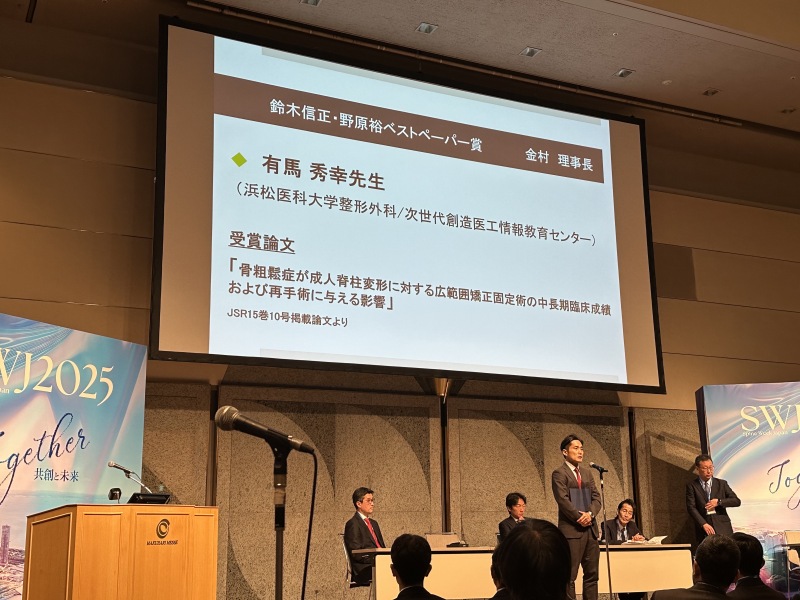 有馬秀幸先生が2025年10月30日(木)~11月1日(土)に行われた第34回日本脊椎インストゥルメンテーション学会学術集会で、鈴木信正・野原裕ベストペーパー賞を受賞しました。受賞論文名は「骨粗鬆症が成人脊柱変形に対する広範囲矯正固定術の中長期臨床成績および再手術に与える影響」です。